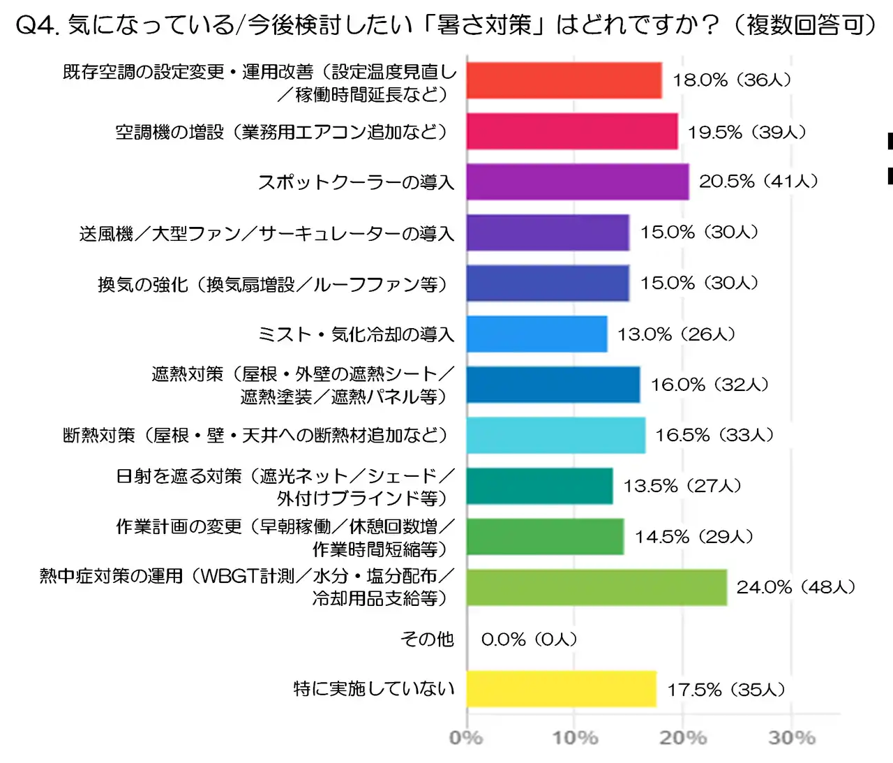 続いて「スポットクーラーの導入」20.5%(41人)、「空調機の増設(業務用エアコン追加など)」19.5%(39人)、「既存空調の設定変更・運用改善(設定温度見直し/稼働時間延長など)」18.0%(36人)と、空調関連の強化が上位に並びました。現在の設備では十分とは言えず、より直接的に温度を下げる施策を検討する企業が多いことが見て取れます。 |