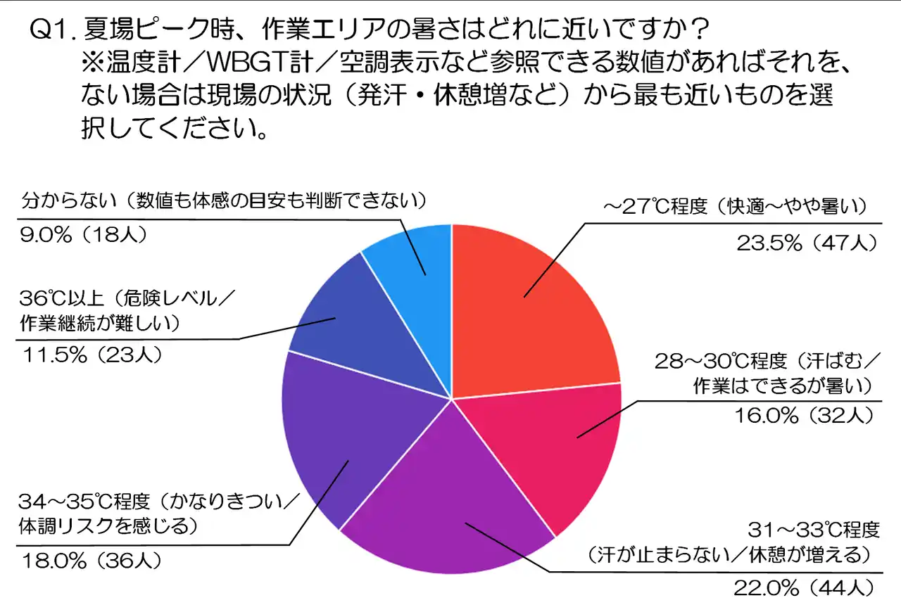 Q1.夏場ピーク時、作業エリアの暑さはどれに近いですか? ※温度計/WBGT計/空調表示など参照できる数値があればそれを、ない場合は現場の状況(発汗・休憩増など)から最も近いものを選択してください。 |