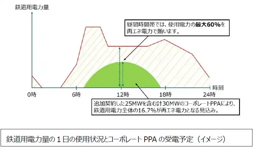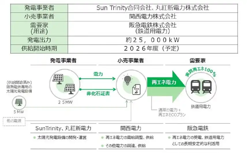 阪急電鉄では、本日鉄道用電力においてコーポレートPPA※1を25MW分追加契約しました。これにより、2025年4月に受電を開始したコーポレートPPA 5MW分と合わせて合計30MWのコーポレートPPAを契約したこととなります。今回の追加契約は関西電力との間で締結したもので、Sun Trinity合同会社および丸紅新電力株式会社を発電事業者とし、新たな太陽光発電設備の開発・運営により発電される電力を活用します。 |
