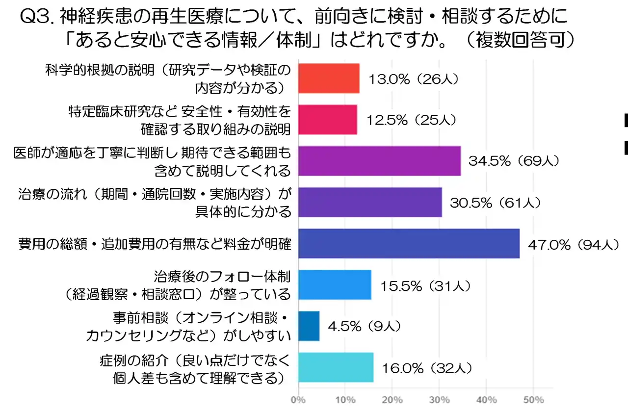 Q3.神経疾患の再生医療について、前向きに検討・相談するために「あると安心できる情報/体制」はどれですか。(複数回答可:注2) |