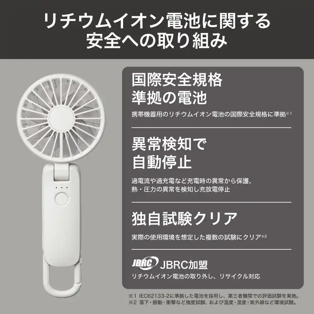 | リズム株式会社は、2016年よりハンディファンを発売しております。昨今、リチウムイオン電池が内蔵された製品の事故が報道されるなど、電池の安全性に対する関心が高まっています。 | ||||||||||