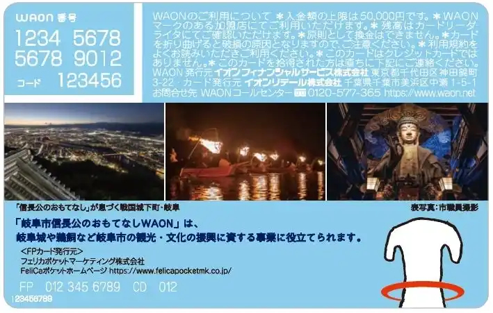 このたびのご当地WAONの発行は、本協定の取り組みの一環で実施するものであり、「岐阜市信長公のおもてなしWAON」を、イオンのグループ対象店舗をはじめとする全国約162万カ所以上のWAON加盟店でご利用いただくと、そのお支払い金額の一部をイオンが岐阜市に寄付し、市の観光・文化の振に惟関する事業にお役立ていただきます。 |