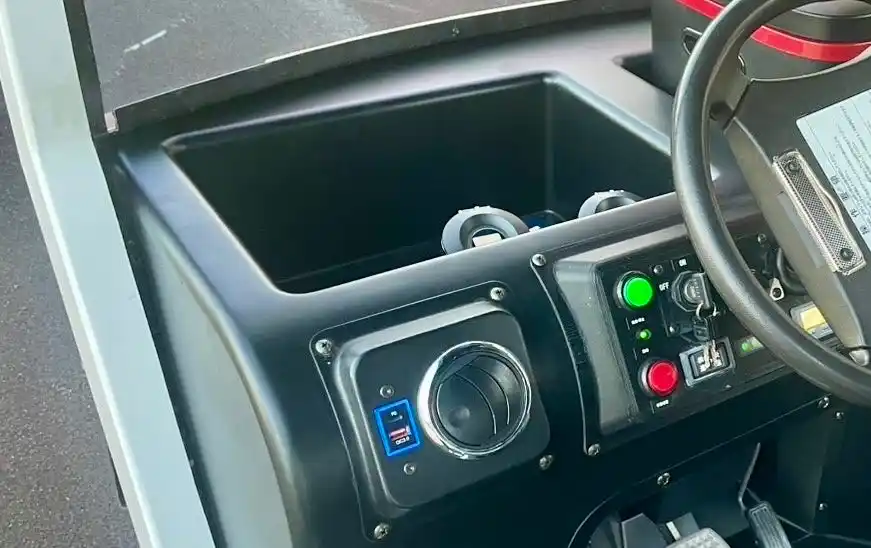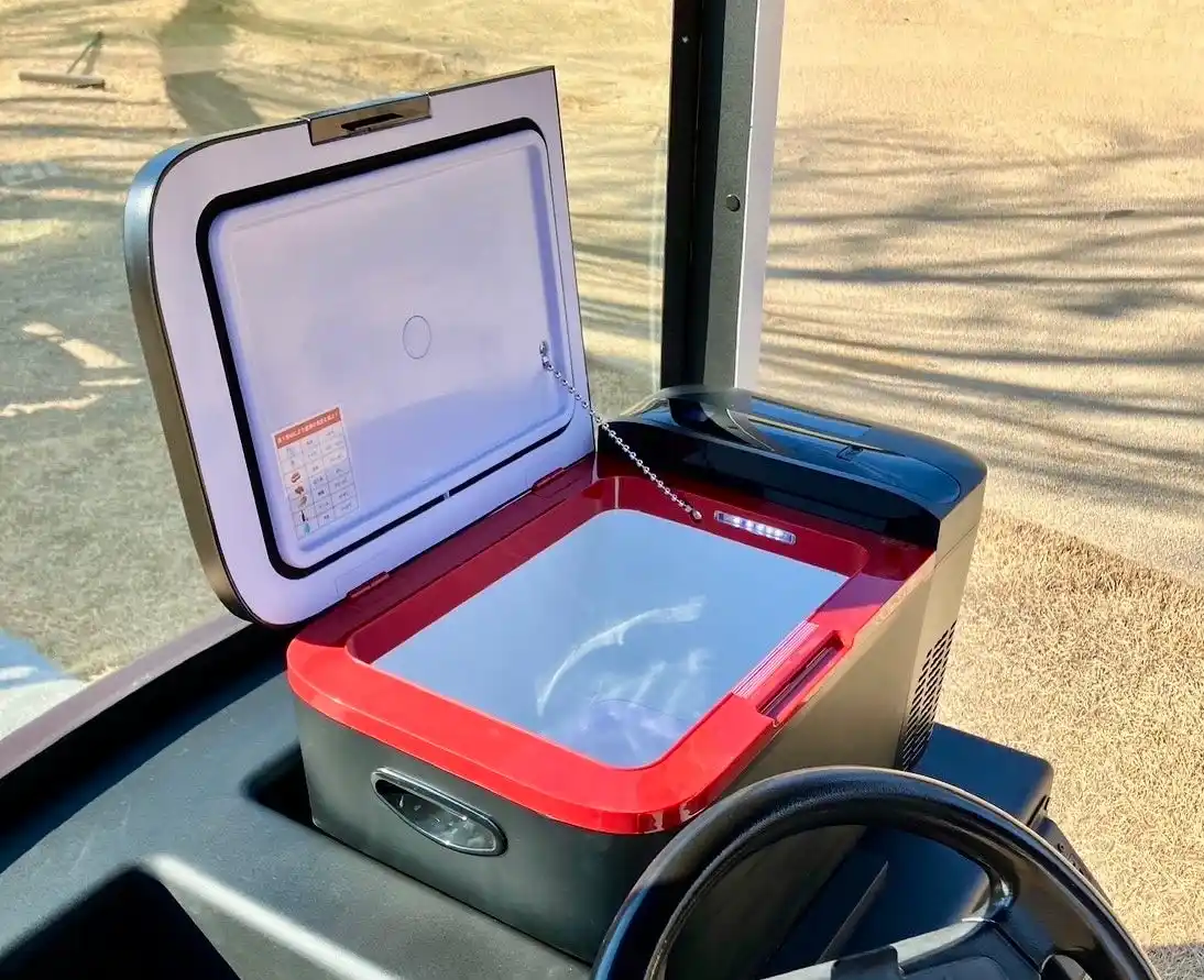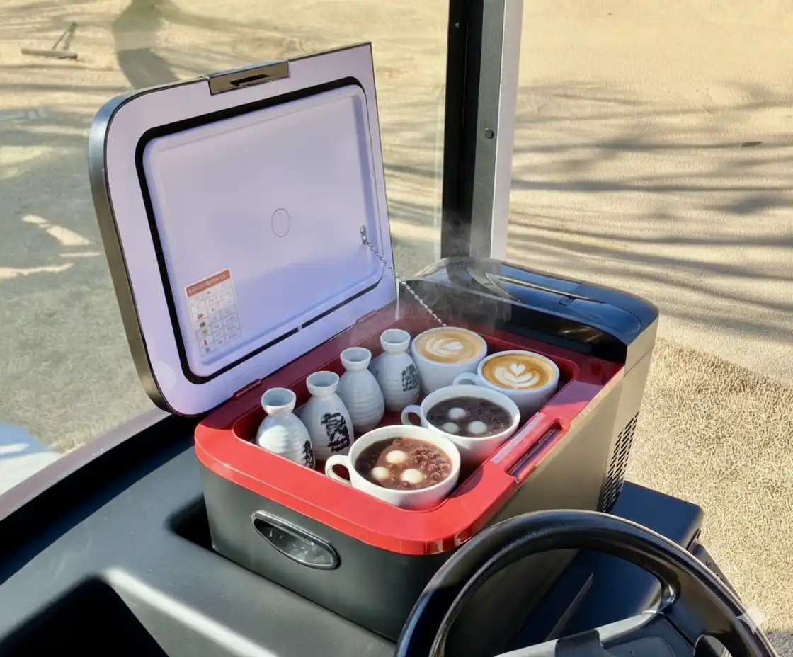 また、カート車内のダッシュボードと一体化した電動温冷庫も備えており、夏場は冷たいドリンクを、冬場は温かいドリンクを楽しむことができます。電動温冷庫はマイナス20℃からプラス50℃の範囲で冷却・加温が可能です。車内にはUSBポートも搭載しているため、ラウンド中の携帯電話などの充電切れを防げます。 |