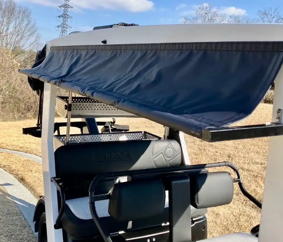 さらに、車内は広々とした空間となっており、ゆったりと寛ぐことができます。座部のシートは夏用と冬用を取り替えることで、各季節に最適な座り心地を堪能できます。なお、2027年からはホリエのWi-Fiを搭載予定で、ラウンド中でもストレスなくソーシャルメディアを楽しんだり、オンラインでの打ち合わせを行うことも可能になります。加えて、小雨が降ってきた場合や夏場の厳しい日差しを避けるために、屋根の横にはカフェのようなサイドオーニングを搭載しており、小雨や直射日光からプレイヤーを守ることができます。さらに、雨からゴルフバッグを守るリアの雨具は、馬車幌のようにワンタッチで広げられ、大切なゴルフクラブを瞬時に雨から保護します。 |