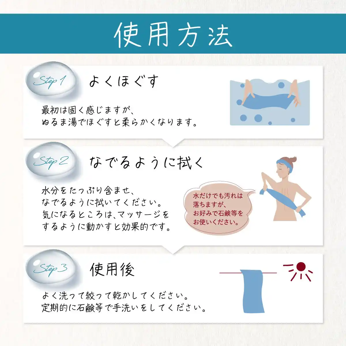 | ・こだわりの今治製:愛媛県今治市の伝統的な技術で織り上げられた、肌当たりの良い綿100%のタオルを使用。 | |||||||||