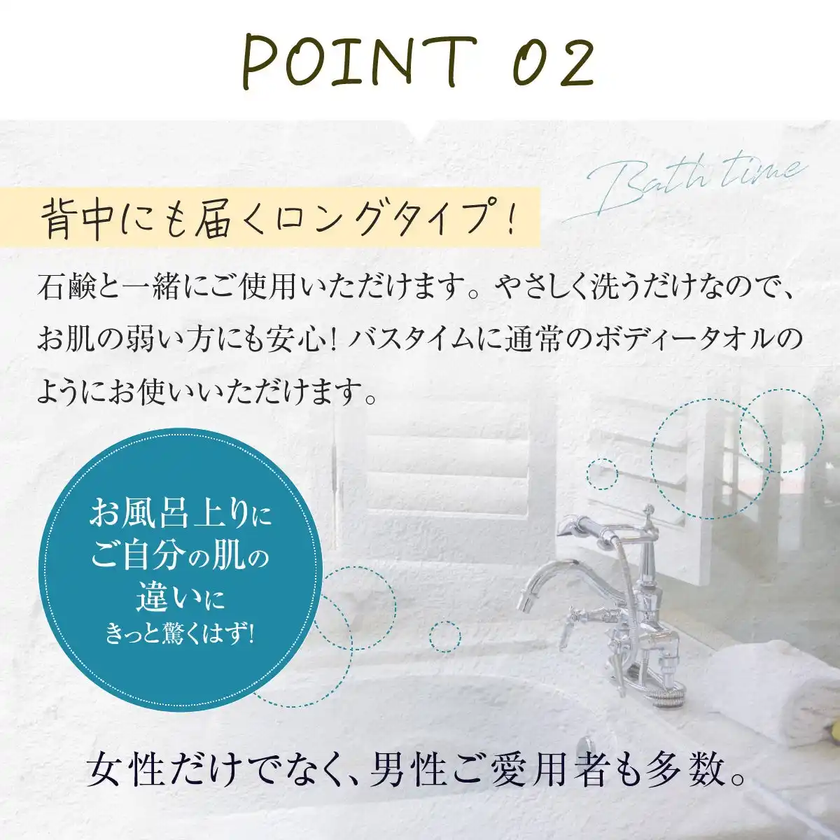 | ・ゴムの吸着力と摩擦力:特殊ゴム加工が古い角質をキャッチし、お肌を傷めず優しくピーリング。 | |||||||||