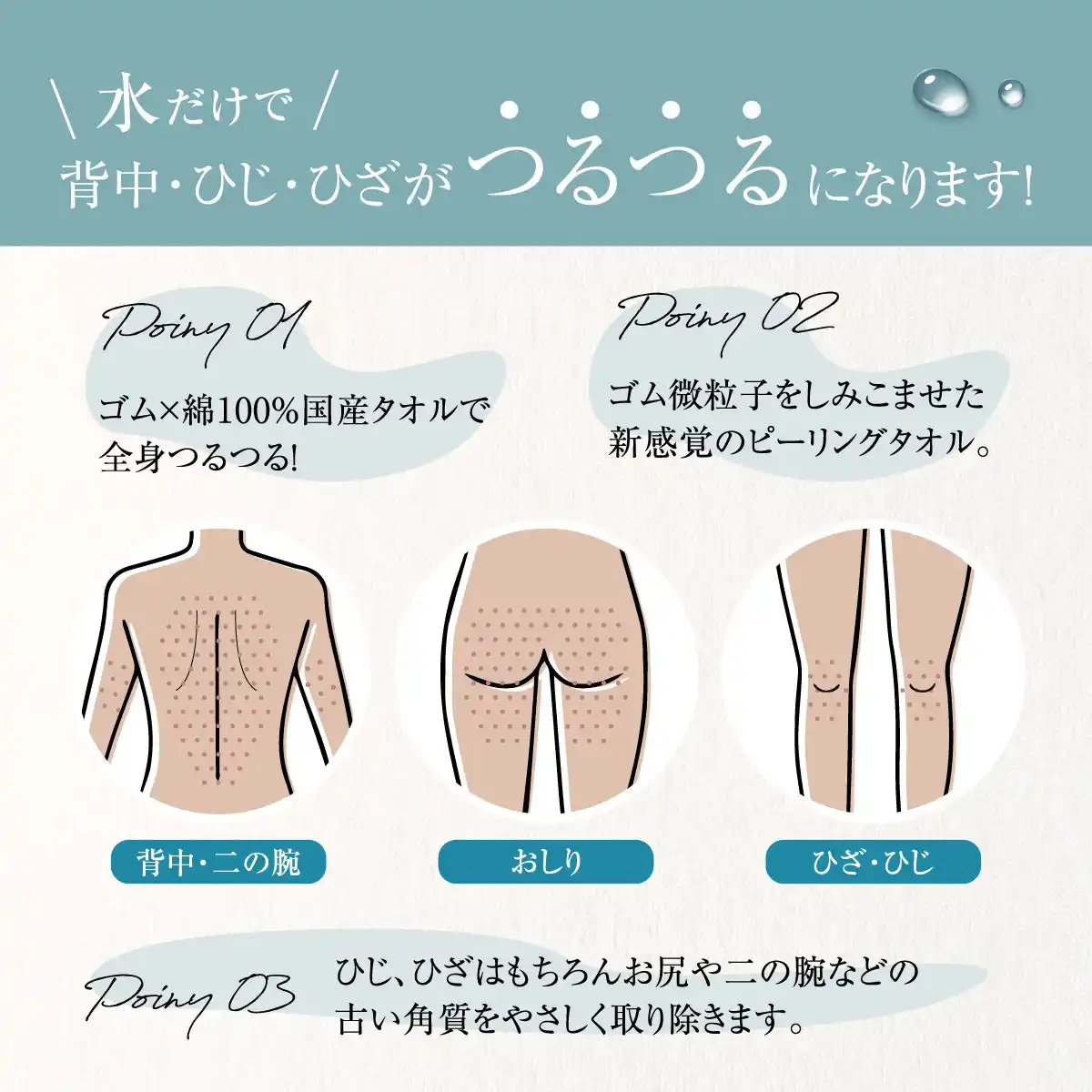 | 「ゴムポンつるつる」は、タオルの繊維一本一本に特殊な微粒子のゴムをコーティングした、新感覚のピーリングタオルです。 消しゴムが汚れを巻き取っていく原理を応用し、水に濡らして優しくなでるだけで、古くなった角質や背中のザラつき、ひじ・ひざ・かかとのガサガサをスッキリと取り除きます。石鹸を使わなくても「水だけ」でお肌がツルツルになるその実力は、テレビ番組やSNSでも度々話題となり、多くのお客様にご愛用いただいております。 | |||||||||
