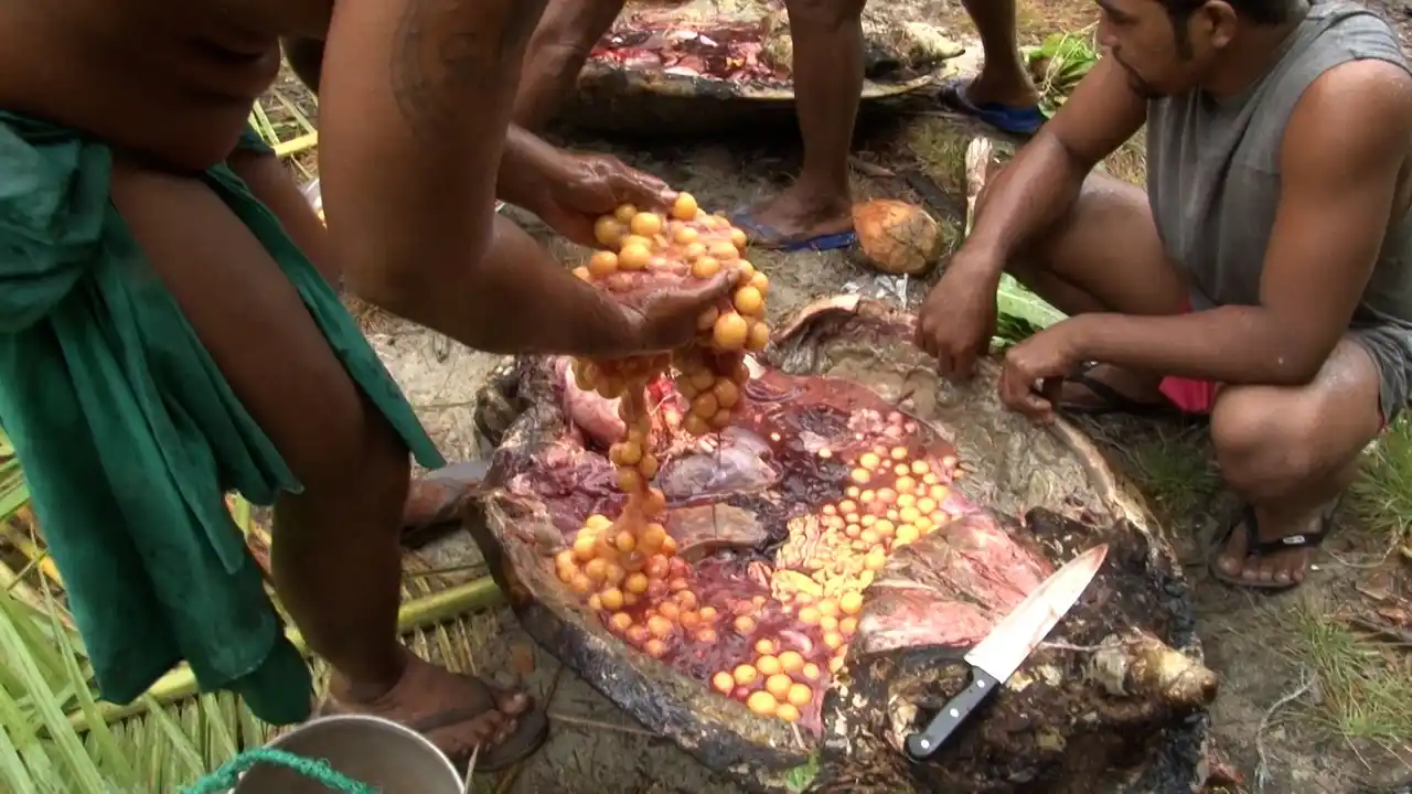 本作には、イルカやウミガメの捕獲・解体や、身体に傷を刻む儀礼の場面が含まれています。これらは人々の生活や儀礼における重要な実践として、文脈を損なわないようあえて残されています。 |