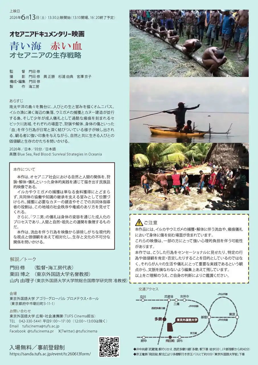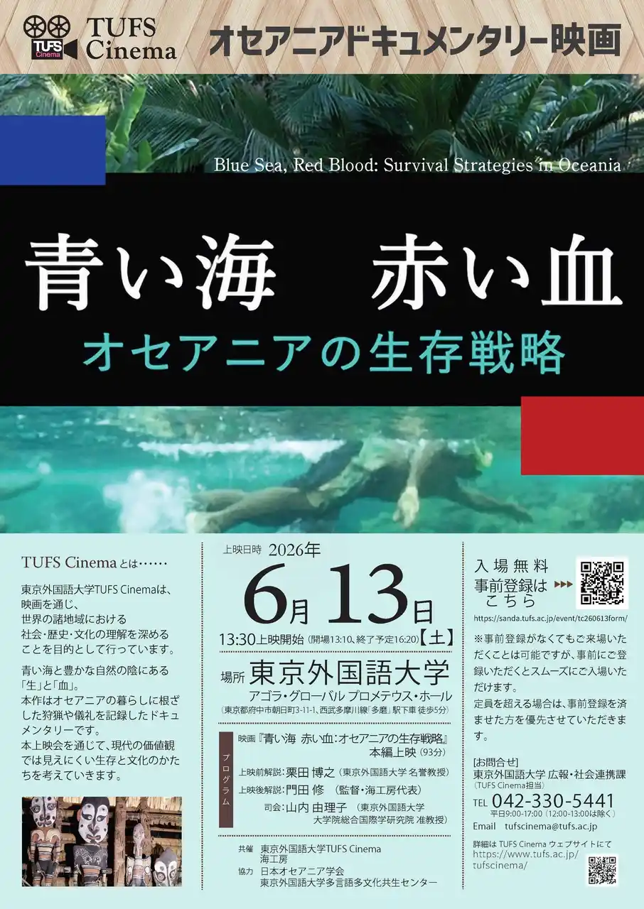東京外国語大学(東京都府中市、学長:春名展生)は、2026年6月13日(土)、TUFS Cinemaにおいて映画『青い海・赤い血:オセアニアの生存戦略』の上映会を開催いたします。 |