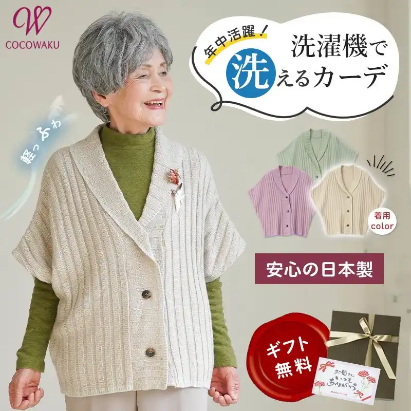 施設内や室内での冷え対策に最適な、軽くて暖かい日本製ニット。洗濯機で丸洗いできるため、お手入れも簡単で贈り物に最適です。 |