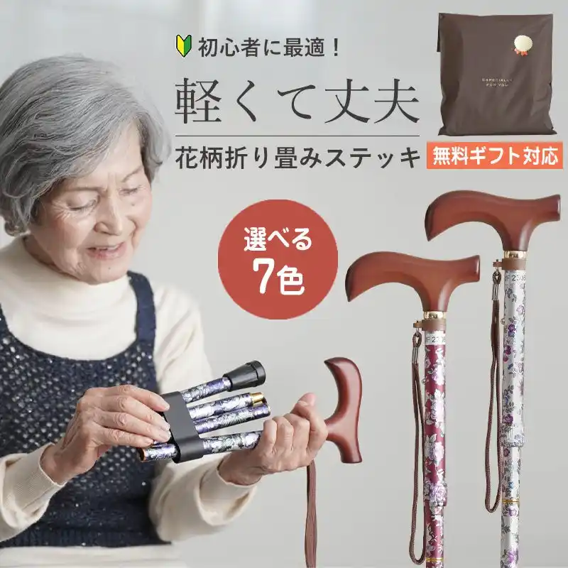 軽量アルミ製で持ち運びしやすく、折りたたみ可能なステッキです。おしゃれな花柄で、ファッションアイテムとして贈れるギフトです。身長に合わせて長さ調節も可能なので、使う人に合わせて使用できます。 |
