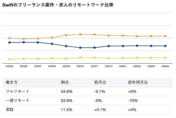 2026年4月時点のSwift向けフリーランス案件・求人におけるリモートワーク比率は、フルリモートが34.6%、一部リモートが53.9%、常駐が11.5%となっています。 |