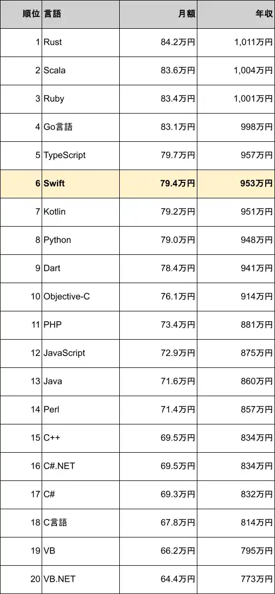Swift案件の平均月額単価は79.4万円、平均年収は953万円で、プログラミング言語別の年収ランキングでは6位に位置しています。 |
