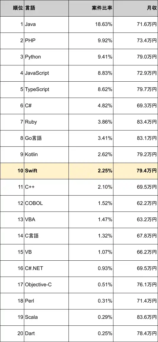 2026年4月時点でSwiftの案件は市場全体の2.25%を占め、案件数は10位、平均月額単価は79.4万円と高い水準を維持しています。 |