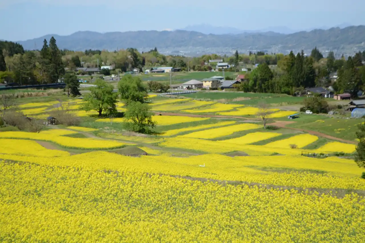 里山文化ゾーンのナノハナ畑も見ごろとなっています。視界いっぱいに広がる6ha、500万本の広大なナノハナ畑は5月上旬ごろまでお楽しみいただけます。ナノハナとの撮影を楽しめるベンチやバス停などのフォトスポットも設置しております。 |