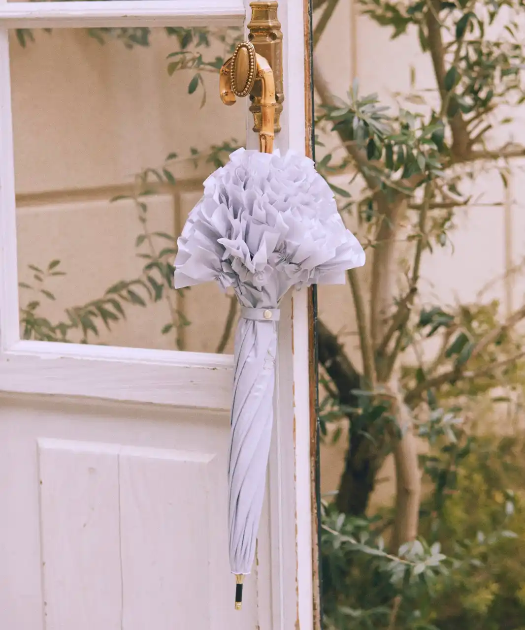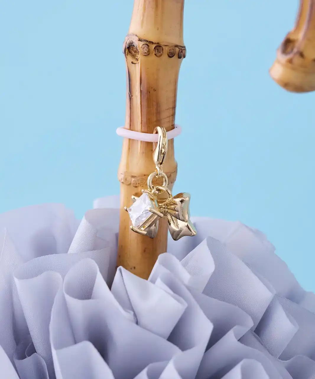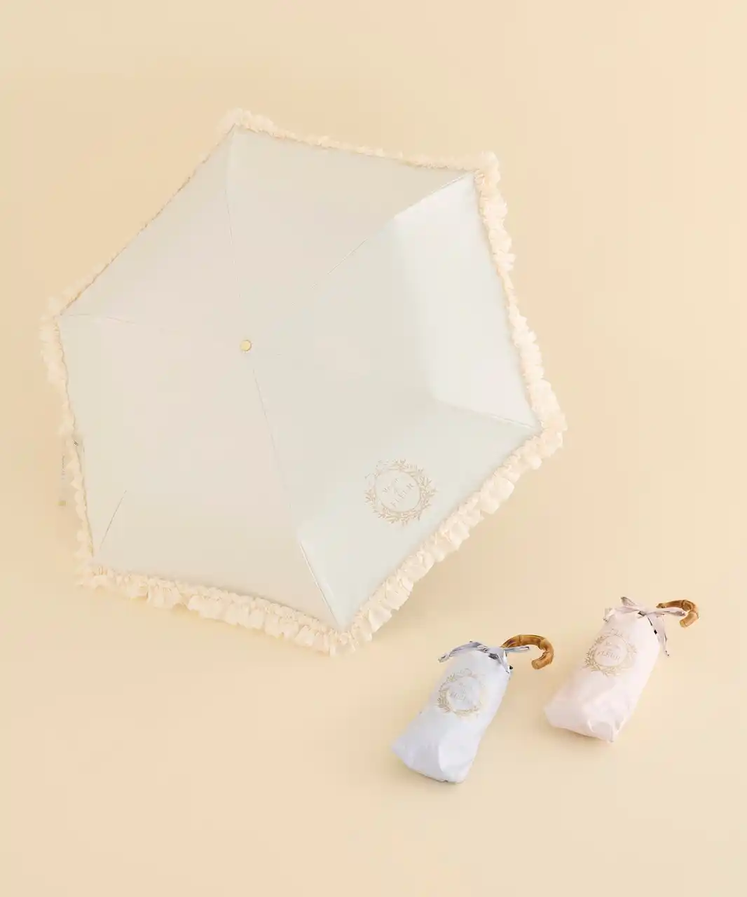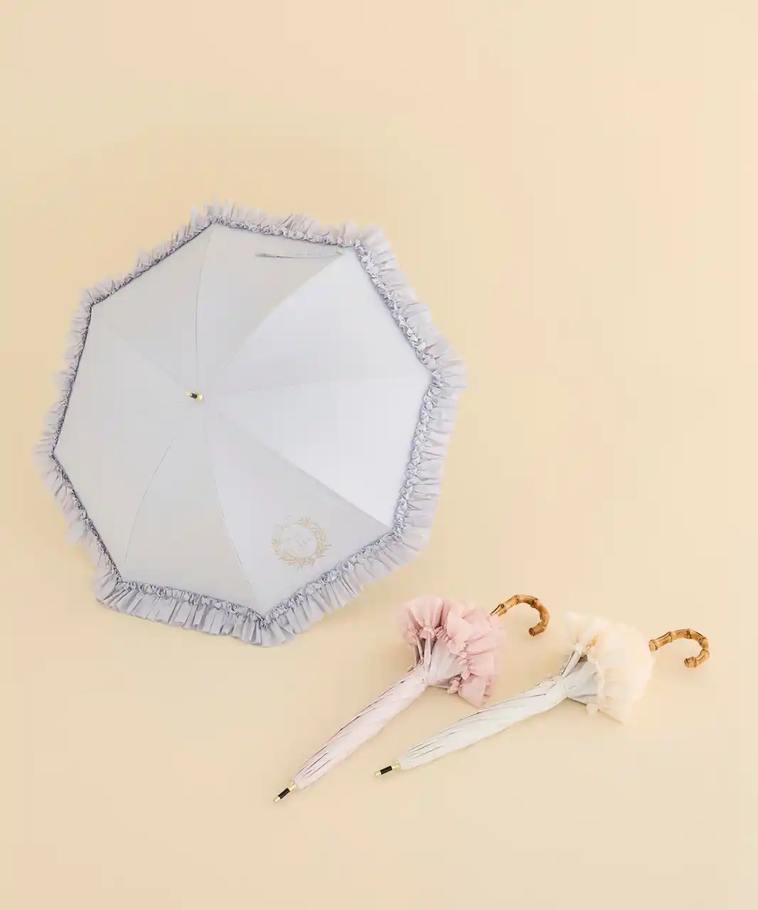 そのほか、紫外線遮蔽率・遮光率ともに100%(※)の生地を使用し、最高基準のUPF50+を取得した高機能な日傘が今年も登場。ラインアップは、高級感のあるバンブーハンドルの長傘、持ち運びに便利な折りたたみ傘、サテンリボンをあしらったコンパクトな折りたたみ傘の全3型。ボリューム感のあるフリルデザインは、開いたときだけでなく閉じた際にも華やかなフォルムを演出。カラーは定番のブラック、ピンクに加え、新色としてアイボリーとグレイッシュブルーを取り揃えております。 |
