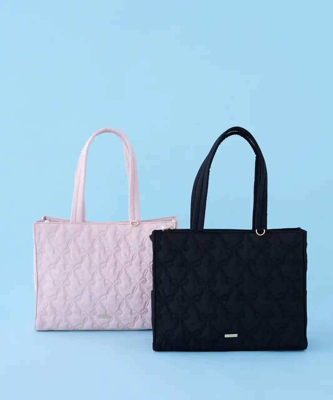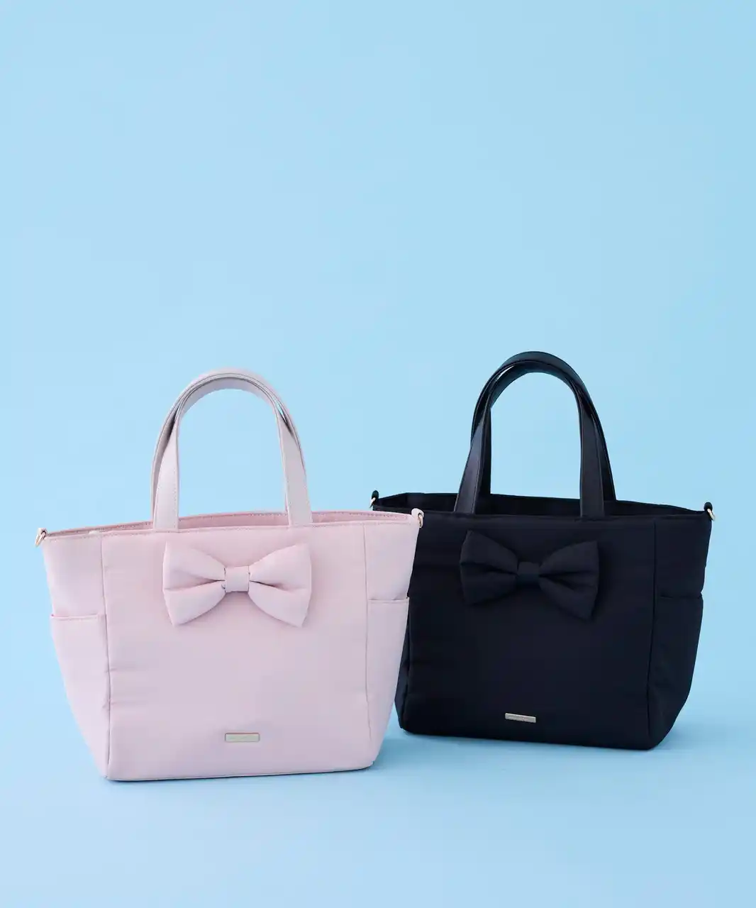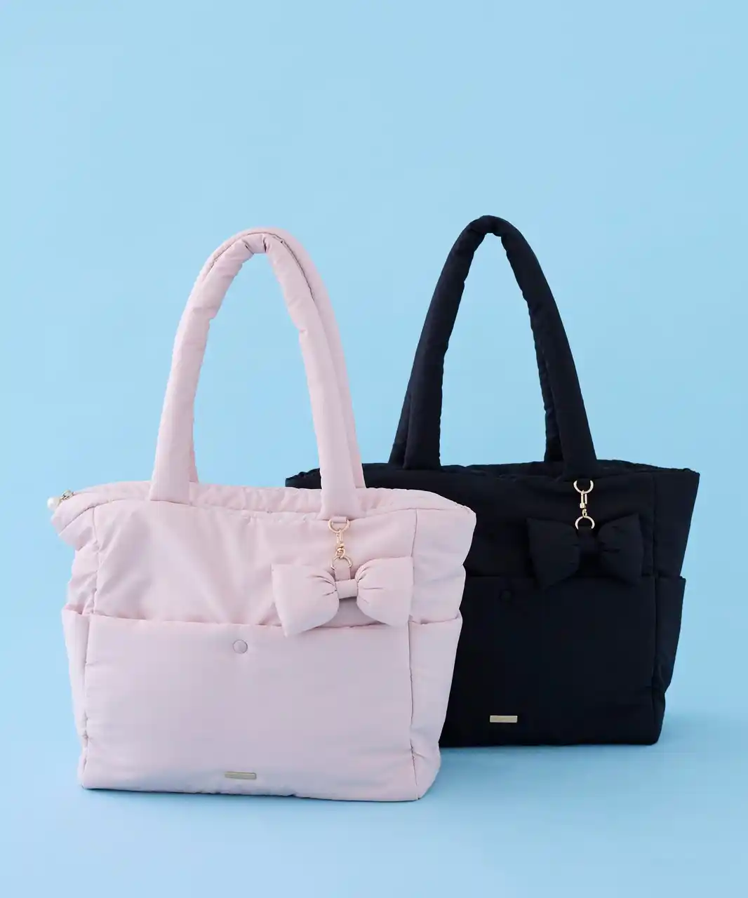 撥水加工を施したバッグは、全3型。フロントのリボンがポイントの2Wayトートバッグや、パファーのエアリーな質感とリボンチャームがかわいいキャリーオンバッグ、リボンをキルティングで表現したバッグをご用意いたしました。軽量でありながら多ポケット仕様による高い収納力で、デイリー使いにもおすすめのアイテムです。 |