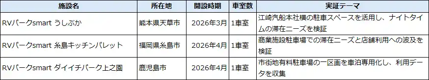 今回オープンしたのは、3月開設の「RVパークsmart うしぶか」、4月開設の「RVパークsmart 糸島キッチンパレット」、「RVパークsmart ダイイチパーク上之園」の3施設です。いずれもまずは1車室から導入し、地域における車泊ニーズや施設利用への波及効果を検証するスモールスタート型の取り組みです。今後の利用状況や利用者データを踏まえ、車室数の増設や運用改善を検討してまいります。 |
