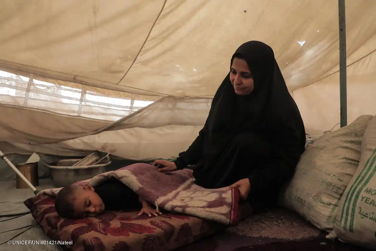 仮設テントや損傷した建物での過酷な生活を強いられるガザで、子どもたちは栄養不良の危機にさらされている(パレスチナ、2025年11月14日撮影)(C) UNICEF/UNI901421/Nateel |