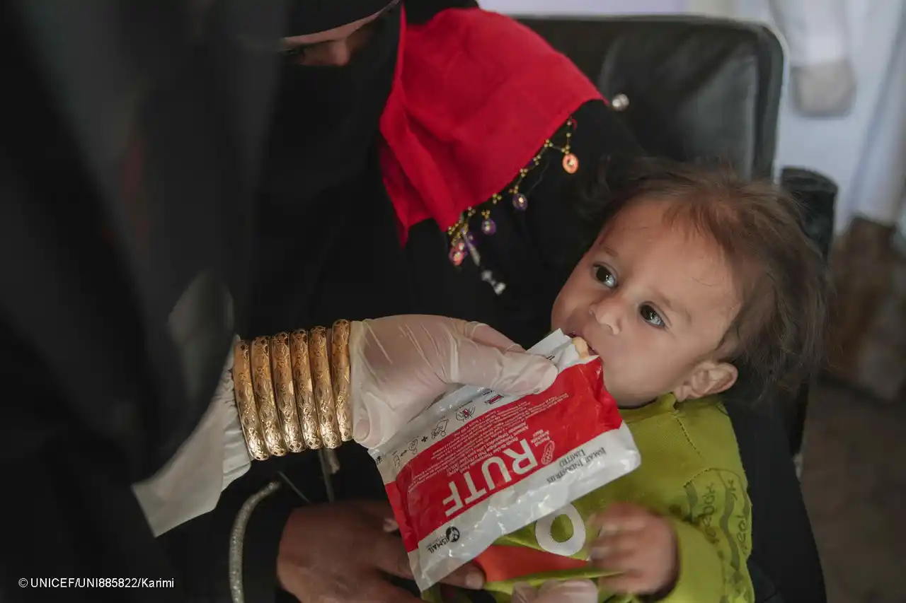 ユニセフ事務局長のキャサリン・ラッセルは次のように述べています。「飢餓の瀬戸際に置かれている子どもが何百万人もいることは、世界に対する警鐘とならなければなりません。2025年には、23カ国で3,500万人以上の子どもが依然として急性栄養不良の状態にあり、そのうち1,000万人近くが重度の消耗症でした。これは食料の不足の問題ではありません。世界中の子どもが、生存と成長のために不可欠な基本的な栄養、安全な水、そして必須のサービスを、確実に利用できるようにするための政治的意志が欠如していることが問題なのです。豊かな世界において、栄養不良のために子どもが苦しんだり命を落としたりする理由はどこにもありません」。 |