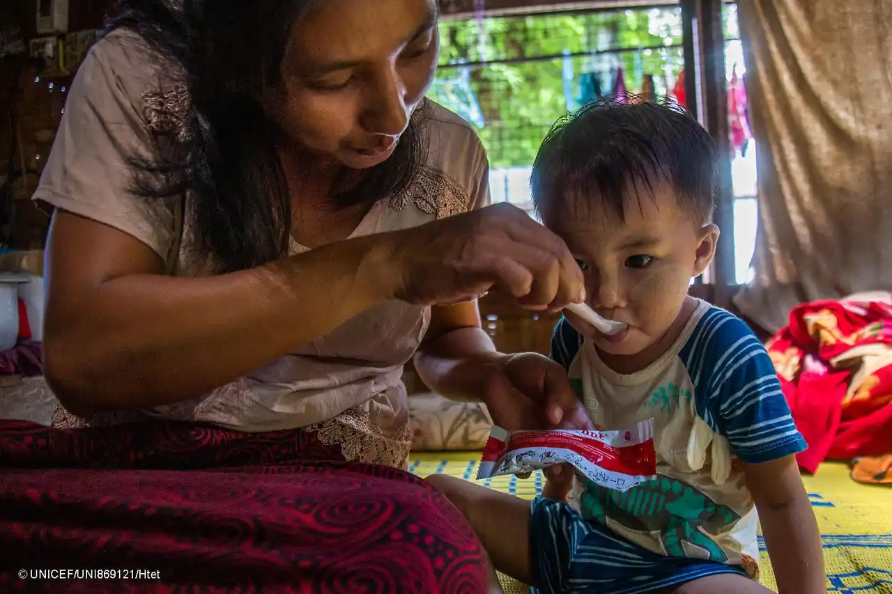 地震の被害が大きかったマンダレーで、すぐに食べられる栄養治療食(RUTF)を食べさせてもらう2歳のシン・ミン・エイちゃん。地震後、栄養不良に陥ったが、ユニセフの支援で少しずつ回復している(ミャンマー、2025年9月22日撮影) (C) UNICEF/UNI869121/Htet |
