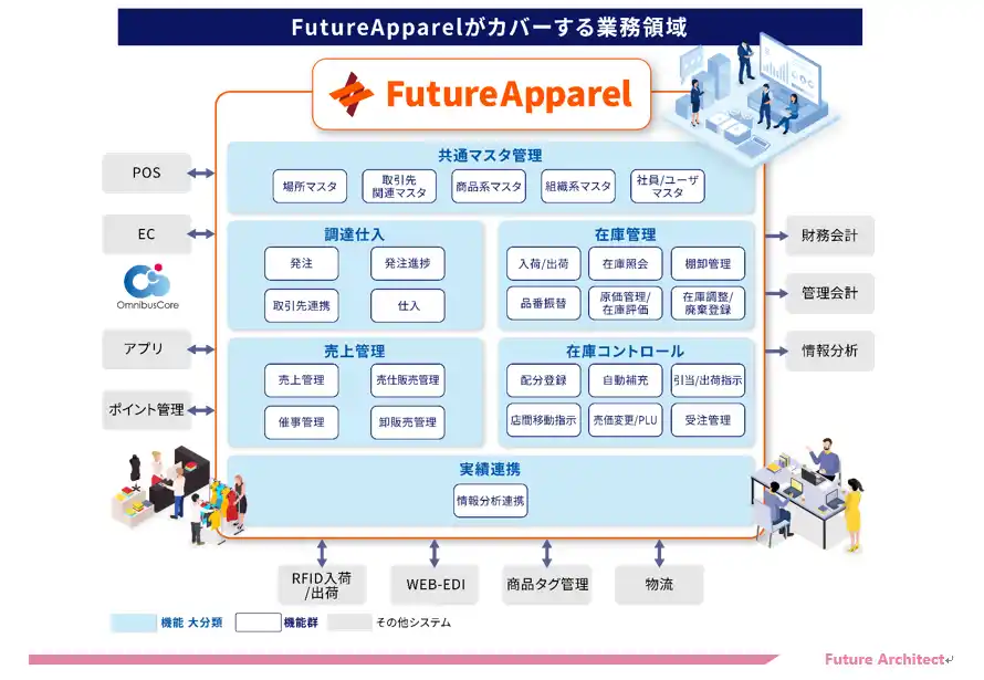 本プロジェクトで導入した「FutureApparel」は、フューチャーアーキテクトのアパレル業界におけるシステム開発の実績をベースに体系化した、アパレル基幹プラットフォームです。マスタ管理、発注・仕入管理、在庫コントロール、入出荷管理、伝票管理といったアパレル業界特有の基幹業務を包括的にカバーし、機能拡張や業容拡大にも迅速に対応できる柔軟な構造が特長です。