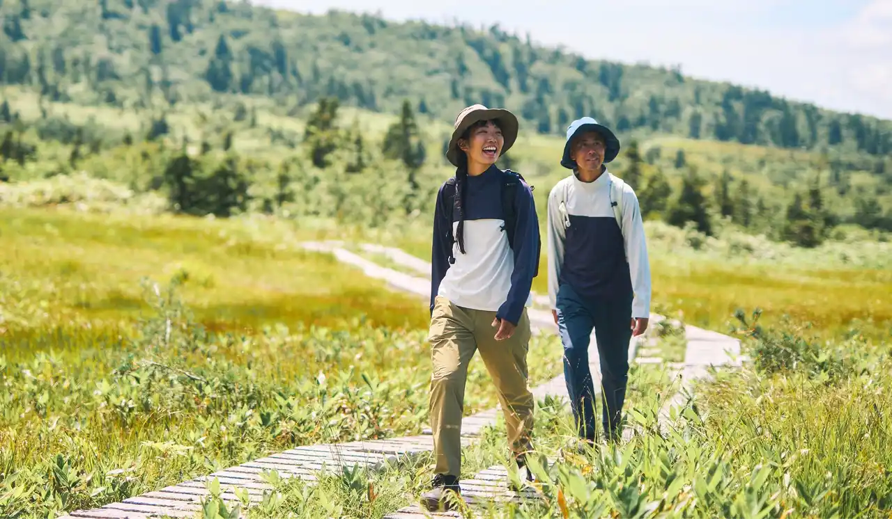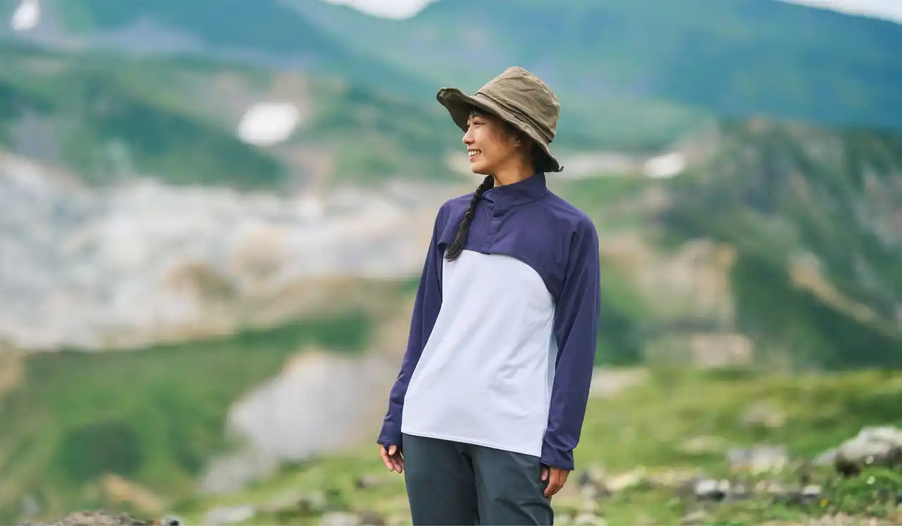 広いツバで顔まわりをしっかり覆うハイキングハット。頭周りのベンチレーションと吸汗素材のスベリで蒸れを抑え、春夏の登山やハイキングで快適に使用できます。 |