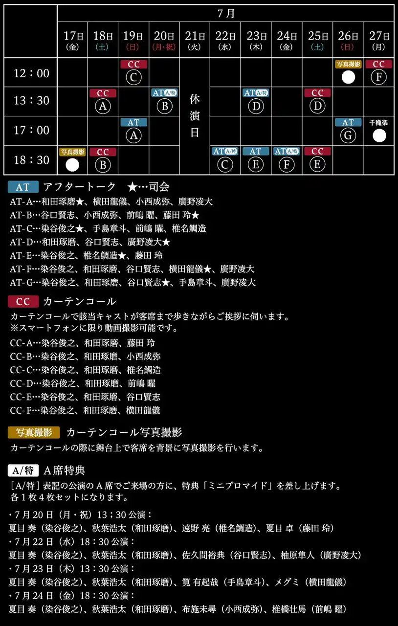 ※一部公演日に、「カーテンコール(該当キャストが客席までご挨拶)」「集合写真撮影」「A席特典ミニブロマイド」の施策が追加されました。 |