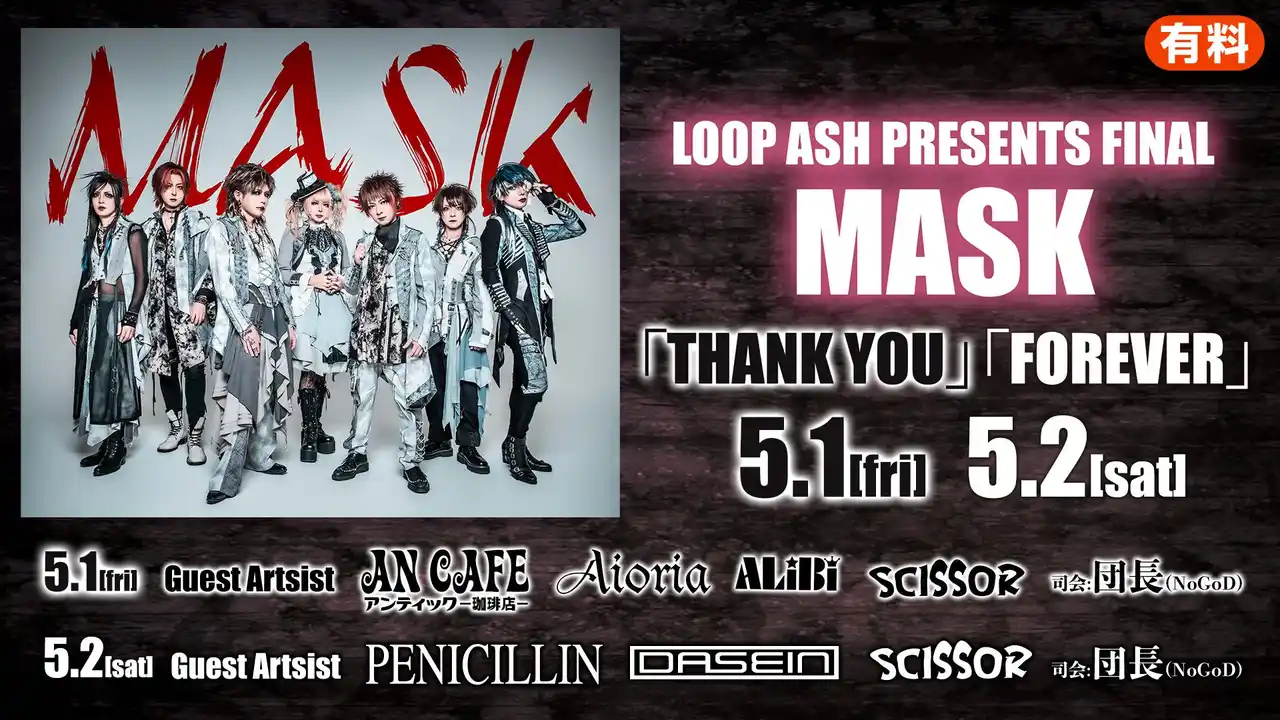 | 2026年5月1日(金)・2日(土)に東京・豊洲PITにて開催されるヴィジュアル系イベント「LOOP ASH PRESENTS FINAL MASK」の模様を、ニコニコ生放送にて視聴チケット制でライブ配信することが決定しました。各日程ごとに豪華アーティストが出演し、会場の熱狂をそのままお届けします。 | |||