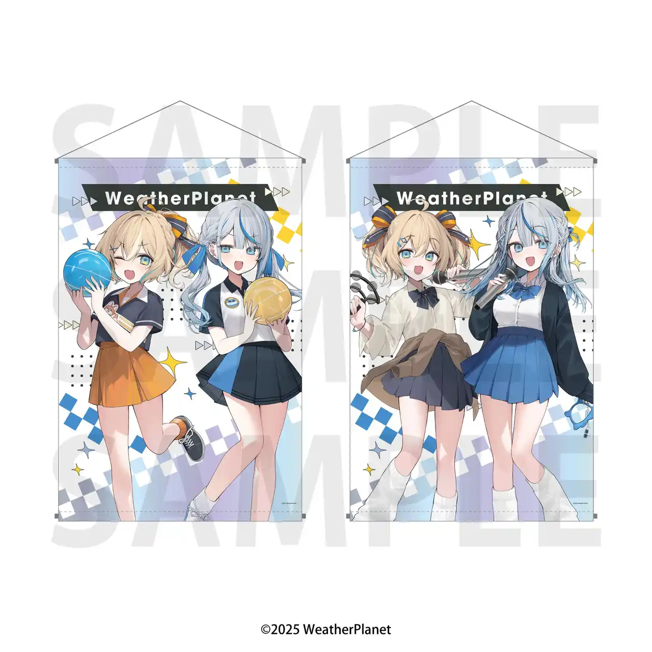 WeatherPlanetの2人がラウンドワンに遊びに来てくれました!学生服でカラオケを楽しむ姿と、ボウラー衣装でボウリングに挑戦する姿を描き下ろししております。描き下ろしイラストを使用したコラボならではの新作アイテムが多数登場します。 |
