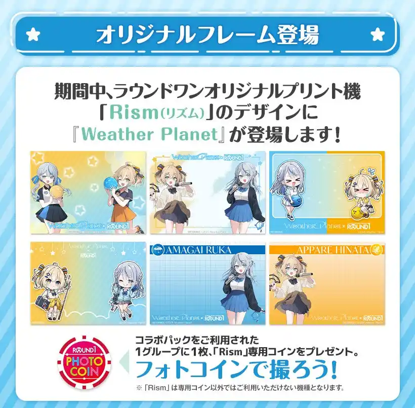 ROUND1のオリジナルフォトプリント機「Rism(リズム)」に、『WeatherPlanet』のコラボデザインが登場します。期間中、コラボパックをご利用の方、またはコラボルームをご利用いただいた方には、限定で「Rism」専用コインを1グループにつき1枚プレゼントいたします。 |