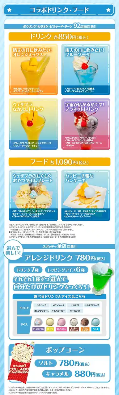 全国のROUND1内にあるボウリング93店舗・カラオケ93店舗・ダーツ71店舗・ビリヤード43店舗にて、コラボメニューを販売いたします。さらに、スポッチャ55店舗では、コラボポップコーンと、お好きなドリンクにアイスを自由にトッピングしてお楽しみいただけるアレンジドリンクもご提供いたします。いずれかの対象メニューをご注文いただいたお客様には、前半【ポップアップコースター(全8種)】、後半【クリアカード(全8種)】をランダムでプレゼントいたします。 |