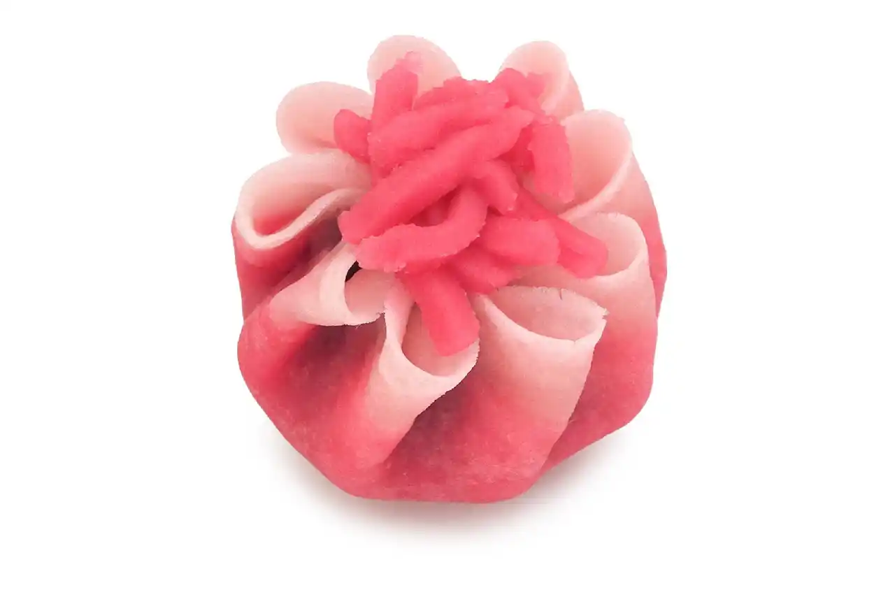 母の日にちなみ、カーネーションをピンクの焼き皮ときんとんで表現いたしました。花びらをあらわす丁寧にたたまれた焼き皮の中には、粒あんを包んでいます。 |