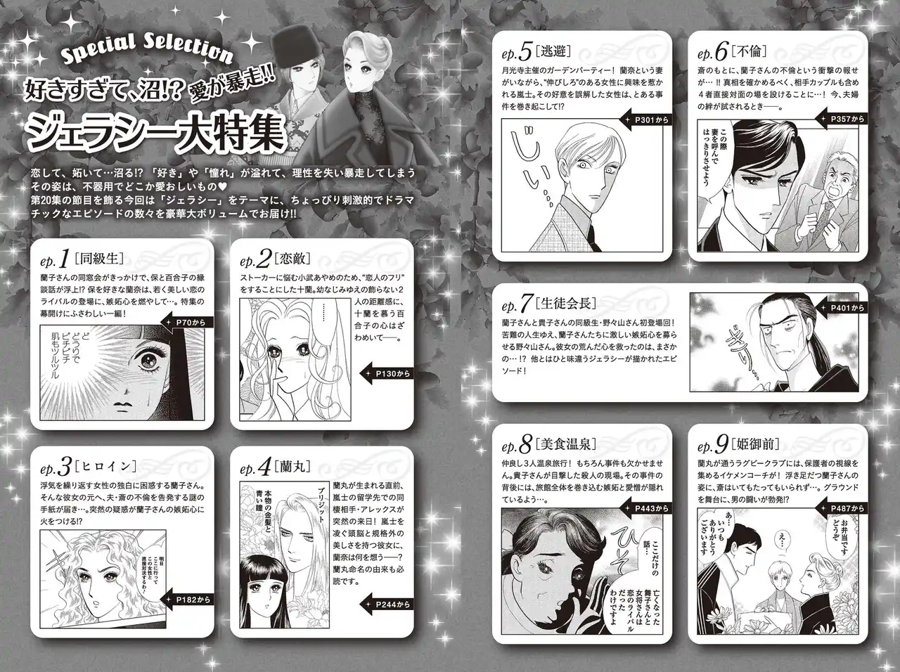 コミックス未収録の2作品に加え、「好きすぎて、沼!? 愛が暴走!! ジェラシー大特集」と題し、「ジェラシー」をテーマに、ちょっぴり刺激的でドラマチックなエピソードの数々を豪華大ボリュームでお届け!! |