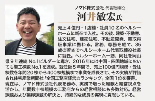 本セミナーでは、かつてヘルシーホームを年間20棟から400棟へと成長させ、全国工務店経営力ランキングNo.1に導いた河井敏弘氏(現:ノマド株式会社代表取締役)と株式会社ビズ・クリエイション代表取締役、初谷昌彦氏にご登壇いただき、工務店における「逆張り」の経営戦略と組織構築についてお話しいただきます。 |