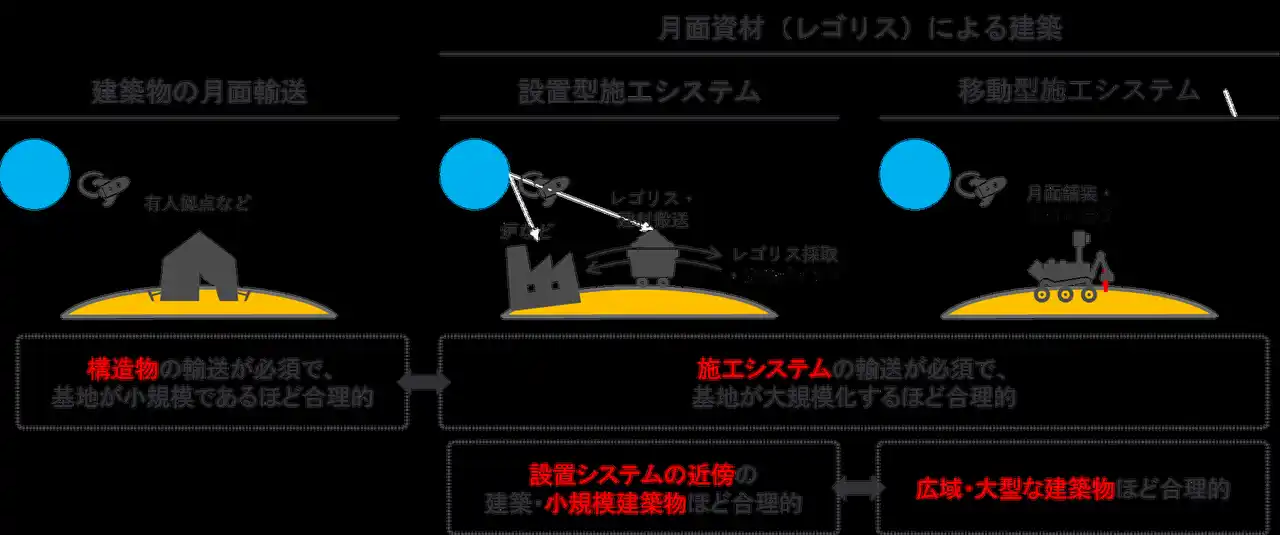 | 月面資源であるレゴリス(月の砂)を用いたインフラ建設技術開発の背景にあるのは、極めて高い輸送コストを如何に抑えるかという課題です。地球から月への輸送コストは1kgあたり1.5~2億円と言われており、輸送可能な重量やサイズにも限りがあります。また、この地球から月への輸送コストに加えて考える必要があるのが、月面上における輸送コストです。通信やエネルギーの問題に加え、月面土壌環境や地形等からも多量の物資を月面で輸送するのは容易ではありません。このことから、地球からの建材の輸送を必要としない月面資源であるレゴリスを用いた建設技術、さらに言えば、まさにその施工現場に存在する資源であるレゴリスを用いた建設技術が理想的だと考えられます。 | |||