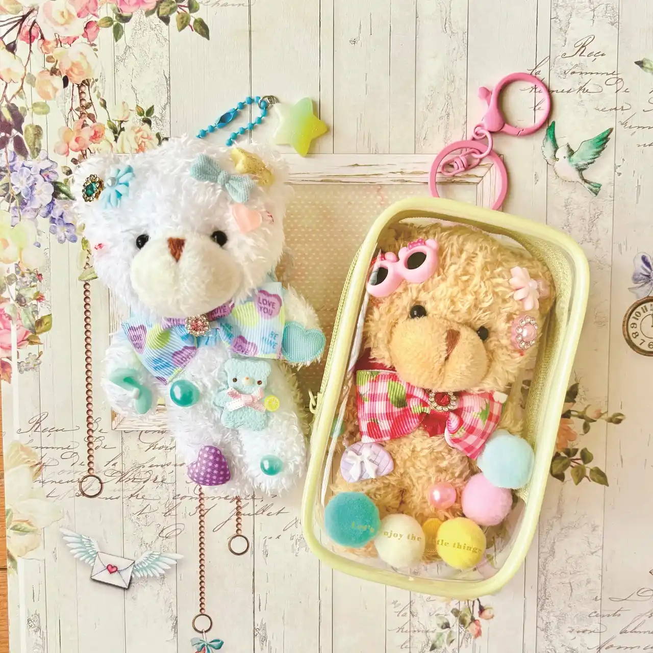 フリルやボンボンが付いたバッグにお好きな目や耳などをレイアウト、可愛いオリジナルバッグに仕上げます。 |
