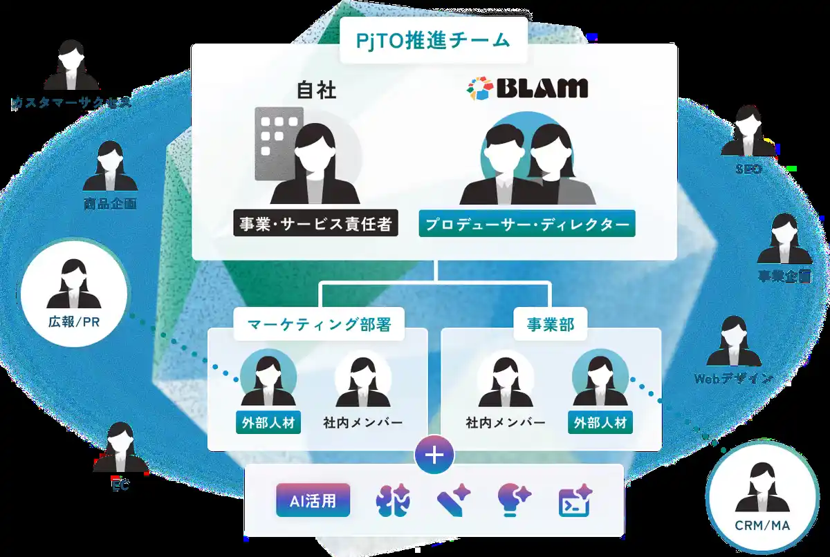 PjTO(Project Team Optimization)マーケティングは、カイコクに登録する13,000人以上のエース人材と、経験豊富なBLAMプロデューサーが組み合わさることで、戦略立案から施策実行まで一貫して推進できる柔軟なプロジェクトチームを提供するBLAMの独自サービスです。 |