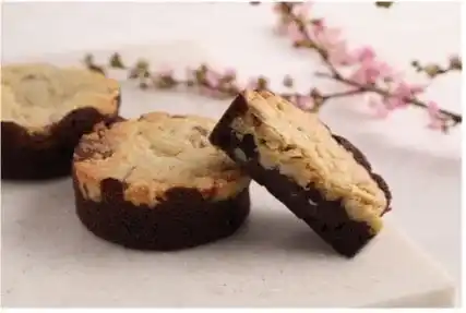 しっとり濃厚なブラウニーの中心には、とろけるヘーゼルナッツのガナッシュを忍ばせ、上にはヘーゼルナッツ入りクッキーを重ねて、やさしい甘さとサクサクの食感を添えました。 |