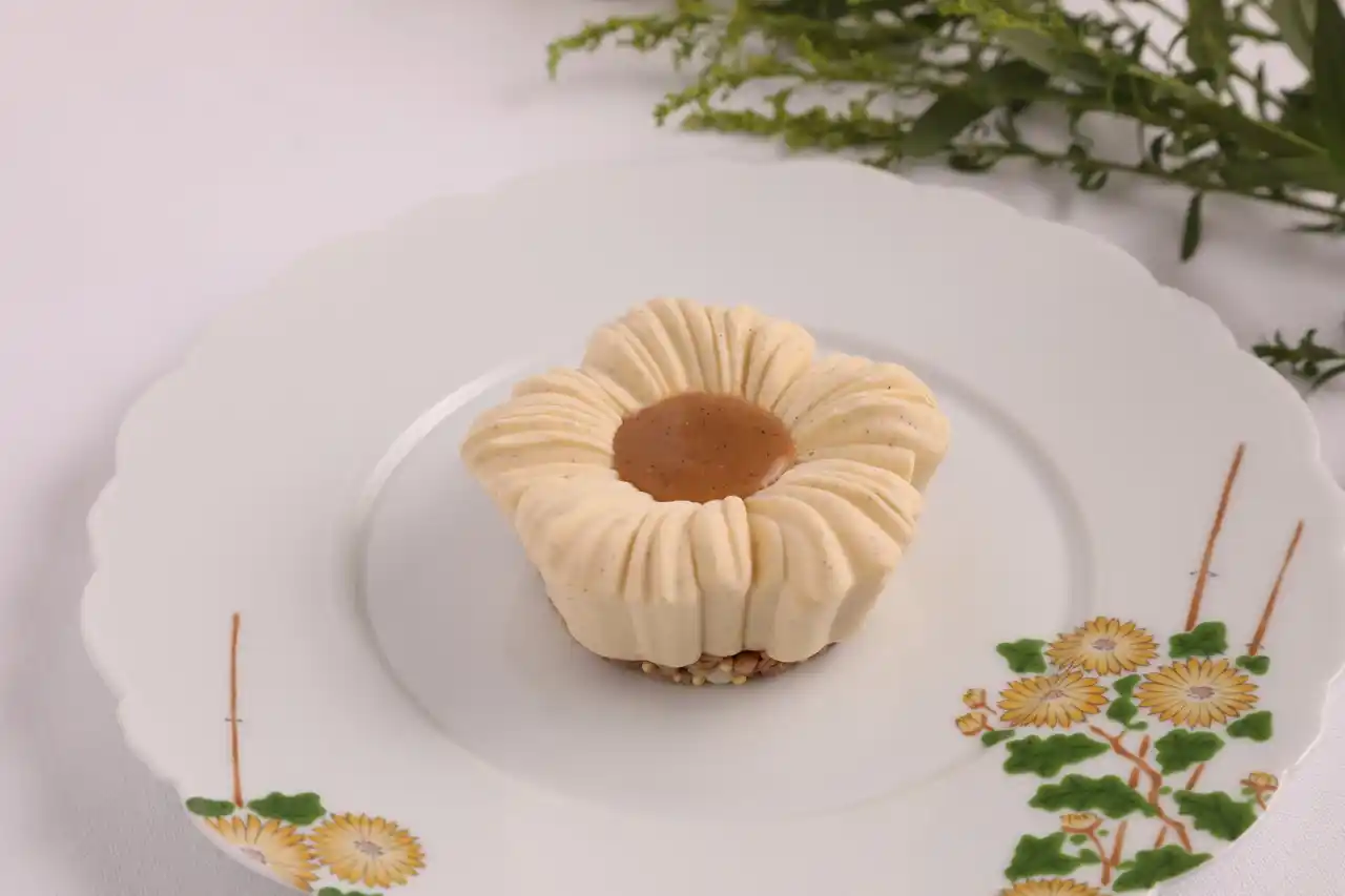 バニラのやさしい甘みと軽やかな口当たりに、キャラメルの深いコクが美しく重なり合う一品です。贅沢に香るバニラを主役に、クリーミーなライスプディングとなめらかなキャラメルが濃厚なハーモニーを生み出し、軽やかなバニラムースとサクサクとしたパフライスが心地よいアクセントを添えています。土台となるクリスピー生地には、そばの実やきびを忍ばせ、奥行きのある食感と豊かな風味をプラス。時代を超えて愛されてきたフランスのデザートを、洗練された現代的な解釈で表現しました。 |