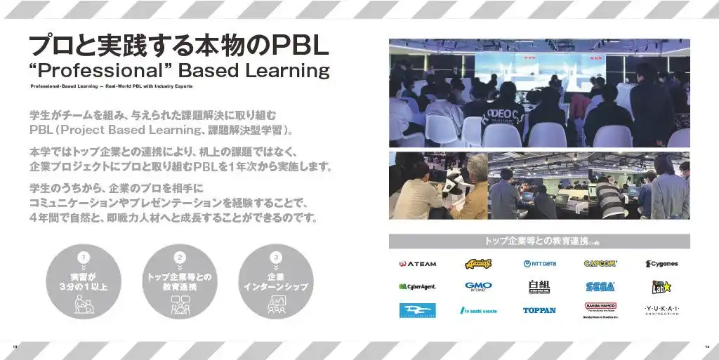 指導陣には、IBM、TOYOTA、任天堂、NTT、バンダイナムコスタジオ、カプコン・・・業界トップ企業、グローバル企業出身の実務家教員がそろいます。学生全員が超・長期インターンシップも行い、これからの産業界や社会のニーズに応える高度な実践力や応用力が身につきます。 |