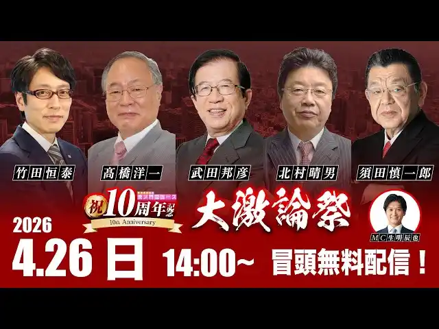・イベント名:祝10周年 真相深入り!虎ノ門ニュース 大激論祭 ・開催日:2026年4月26日(日) ・会場:有楽町朝日ホール(東京都千代田区有楽町2-5-1 有楽町マリオン11F) ・出演者(順不同): 【進行役】生明辰也 【ゲスト】北村晴男、須田慎一郎、高橋洋一、武田邦彦、竹田恒泰 |