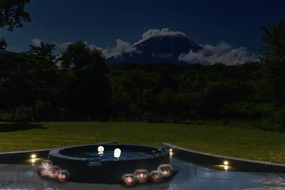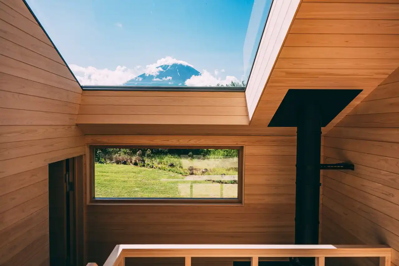 サウナ室はサウナプロデューサー「ととのえ親方」こと松尾大氏が監修。大きめの薪ストーブを配置している為、本格的なセルフロウリュが楽しめる他、プライベートな専用ガーデンには富士山をモチーフにした水風呂と露天風呂も用意しています。サウナ室にいながら富士山を眺められる開放的な設計もリトリート時間にぴったりの幻想的空間です。 |