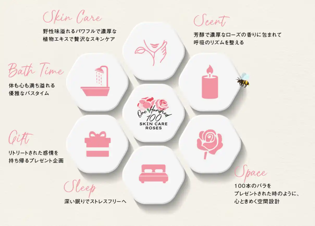 お部屋には6つのコンテンツ(体験)をご用意。お部屋を象徴する空間演出や生花を使用した演出だけでなく、日本未発売のエッセンシャルオイルの香り、そして、大人気のローズスキンケア・ボディケア商品を中心に現品12種類を贅沢に取り揃え、パワフルな植物エキスと芳醇で深みのある自然の香りを楽しめる、新たな肌と心をととのえる“リチュアル(儀式)”をご提供いたします。 6つのコンテンツで自然との融合が叶うリトリート体験は、ミルフィーユのように重なり合い、体と感情をさらにほぐしながら、深く癒されるリラックスタイムへ導きます。 |