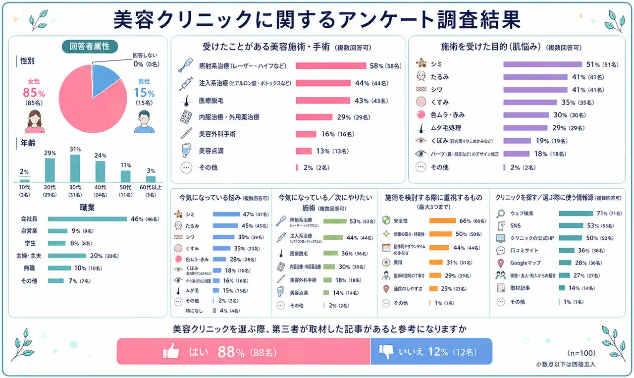 また、クリニック探しに使う情報源は「ウェブ検索(71%)」が最も多く、SNS(53%)を大きく上回りました。そして「第三者が取材した記事があると参考になるか」という問いに対しては、88%が「はい」と回答。広告や主観的な口コミだけでなく、客観的な視点で深掘りされた情報のニーズが高いことが判明しました。 |