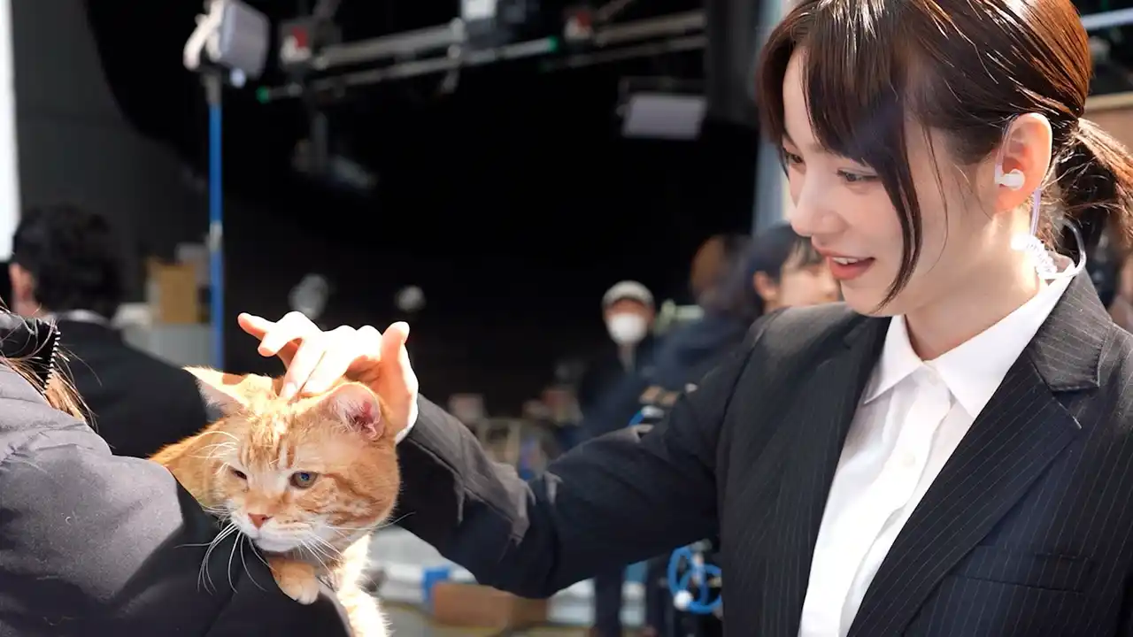 また、のんさんは怪しげなスーツ集団と笑顔で振り付けを踊るシーンにも挑戦し、作品のコミカルな世界観を表現。さらに、「クロじゃなくてゼロでしたね!」というセリフを、思わず「ゼロじゃなくてクロでしたね!」と言い間違えてしまう可愛らしい一幕もあり、現場は笑いに包まれました。撮影の合間には、CMに出演する猫(名前:オレンジ)に「のんと申します。頑張りますので何卒……」とあいさつをし、戯れる微笑ましい様子も見られました。オレンジの愛らしさに、のんさんや撮影スタッフまでもが癒される姿も印象的です。 |