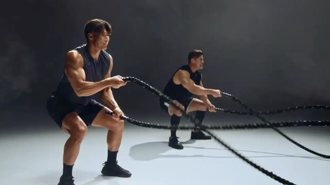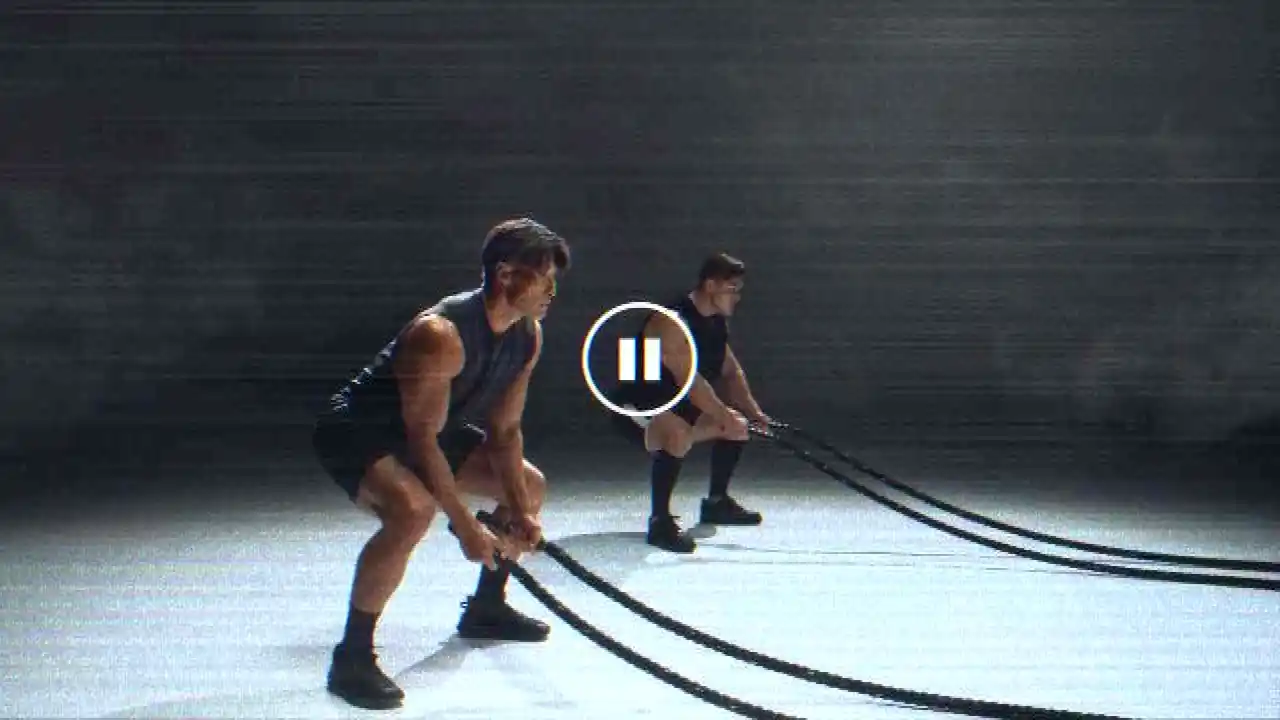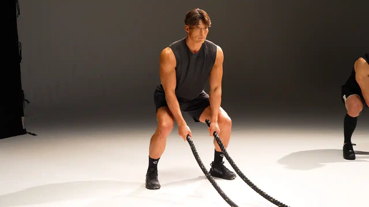 その後は、今回の見どころである“バトルロープ対決”の撮影シーンに移行。撮影現場に設置された二本のロープに対して向かっていくアスリートとしての迫力ある糸井さんの姿に、現場は圧倒されます。撮影が開始し、美しいフォームでロープを躍動させる糸井さん。20秒の長回し撮影に、カットがかかった瞬間「長いわ!」と渾身のツッコミが。撮影した映像を確認し、「OK!・・・今の本物のOKぽかったでしょ(笑)」と話す、お茶目な一面も。計 30分間の“バトルロープ対決”シーンの撮影をやり切り、現場から大きな歓声と拍手に包まれました。 |