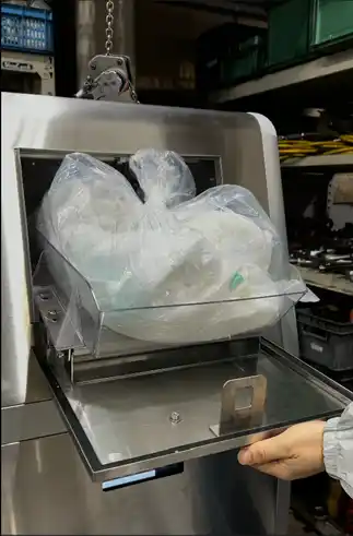 これまでは「200Vに動力変更したうえでなら処理ができる可能性がある」としていたボリュームの大きい投入を、破砕機専門メーカーの知見を活かし100Vの動力のまま可能にしました。 従来通りの2個ずつの投入にももちろん対応しており、たくさんのご要望の声に応え、施設によって違う業務フローに柔軟に対応した形です。 ボリュームタイプの操作もこれまでどおりにシンプル。汚物が入ったままの紙おむつを投入してスタートするだけ。 10個の紙おむつが入った大きなごみ袋のままで一気に投入OKなのもユーザーにはうれしい仕様です。あとはDeasyCareが自動で処理を進めます。従来と違うのは、内部の動きだけ。内部では2~3個分ずつ順に破砕・中和・脱水を繰り返し特に操作は必要ありません。2個ずつ投入する場合と変わらず、約30分後には処理が完了します。 投入以降はスタッフが付き添う必要はないので、操作回数が減ることになります。 |