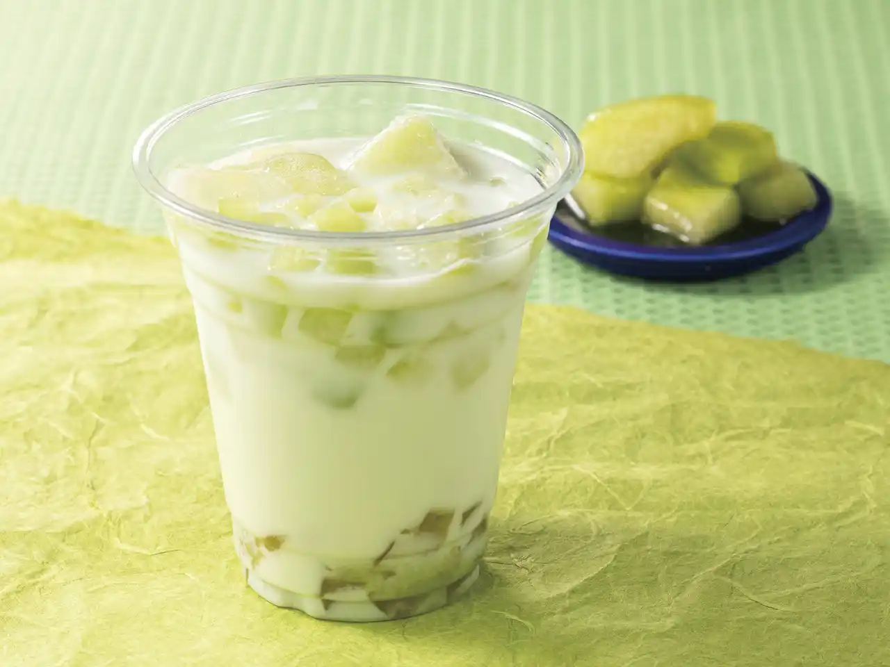 | 豆乳ラテはメロンの果肉がたっぷりと。メロン味のわらび餅を一緒に飲むと、口いっぱいにメロンの風味が広がります。隠し味に柚子のジャムを混ぜており、甘くなりすぎず、最後まで美味しくお楽しみいただけます。 | |||||||||