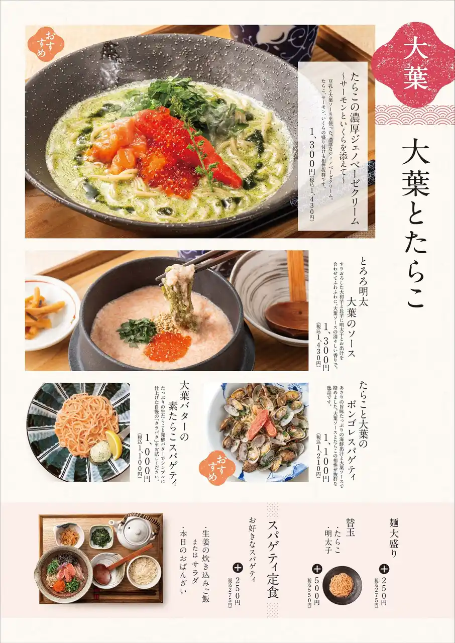 | ・海の幸のたらこクリームスパゲティ 1,400円(税込1,540円) | |||||||||